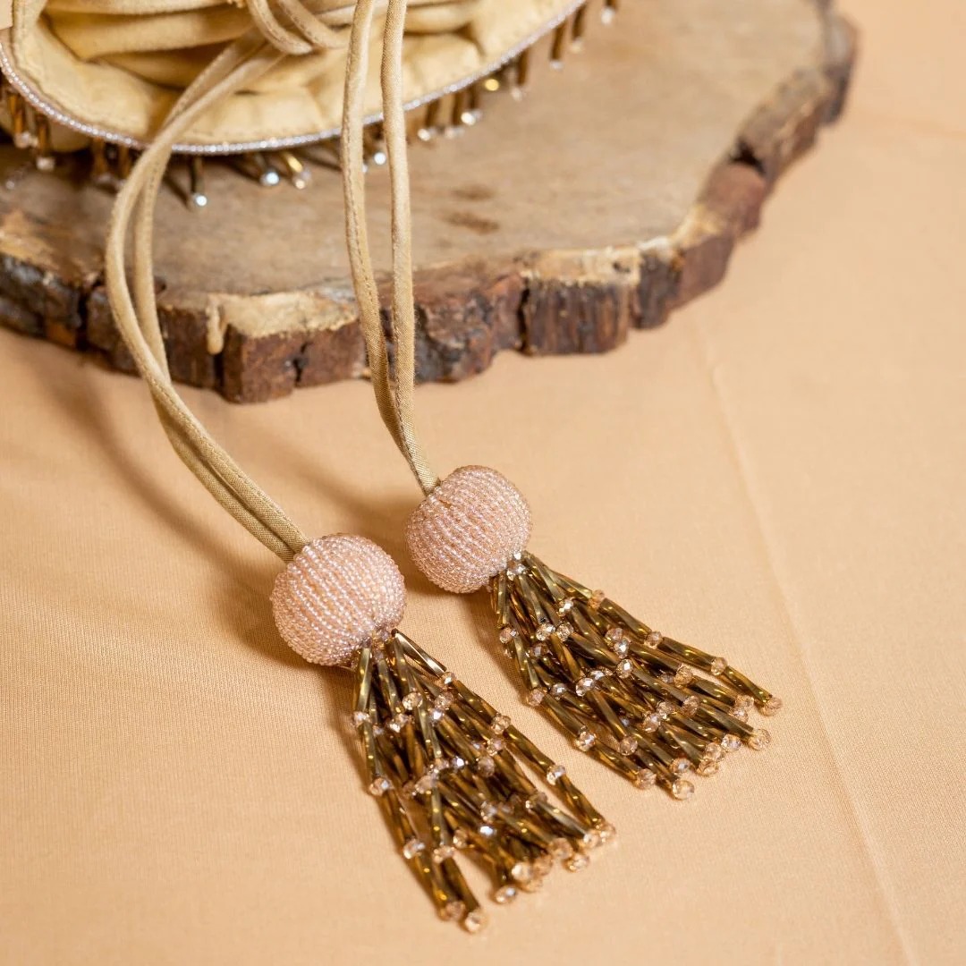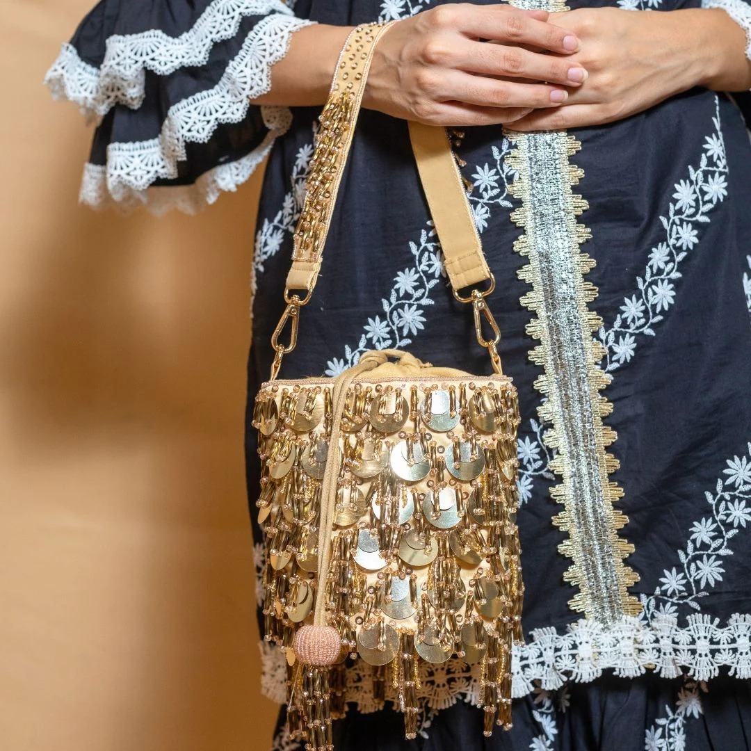 This exquisite handmade bag is a celebration of art and craftsmanship. Featuring vibrant, intricate floral hand embroidery, this drawstring bag embodies the essence of elegance and creativity. The bag is adorned with charming fringe details, giving it a bohemian edge while maintaining a chic and sophisticated look. Perfect for casual outings, evening gatherings, or as a statement piece, this bag brings together functionality and artistry seamlessly.